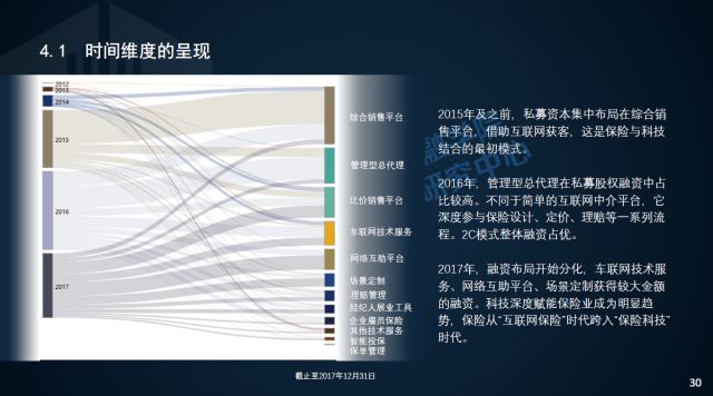 PBCSF从投资人的角度观察了保险科技行业的变化。从时间维度看,2015年之前资本比较集中于传统互联网中介平台;2016年管理型总代理获融资占比较高;2017年融资布局便开始分化,科技深度赋能保险业成为趋势。