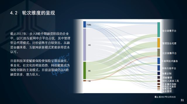 从融资轮次看,截止2017年,进入B轮中期融资的企业中,以2C的互联网中介平台占优,互联网获客模式更能获得资本认可。而目前来看,科技深度赋能保险趋势将成为主流,该领域以A轮融资居多,潜力巨大。