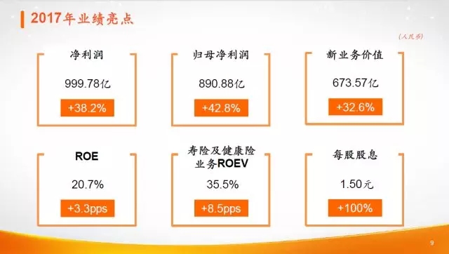 简短来说,2017年,中国平安合计实现营业收入9745.70亿元,同比增长25.8%;总资产达到64930.75亿元,同比增长16.4%;新业务价值高达673.57亿元,同比增长32.6%;集团内含价值达到8251.73亿元,同比增长29.4%;集团累计实现归属于母公司股东的净利润890.88亿元,同比增长超过42.8%。一句话,几乎没有短板的金融巨无霸。