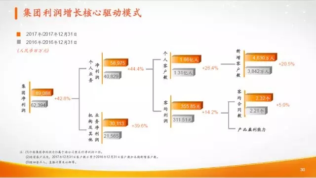 中国平安在年报摘要中也着重介绍了其2017年的客户经营业绩,数据显示,中国平安890.88亿元净利润中,有589.75亿元都来源于个人业务;而截至2017年末该公司共计拥有1.66亿个人客户,相较2016年末增长26.4%;客均利润达到355.85元,同比增长14.2%;客户合同数从2016年的2.21个增长到2017年的2.32个。