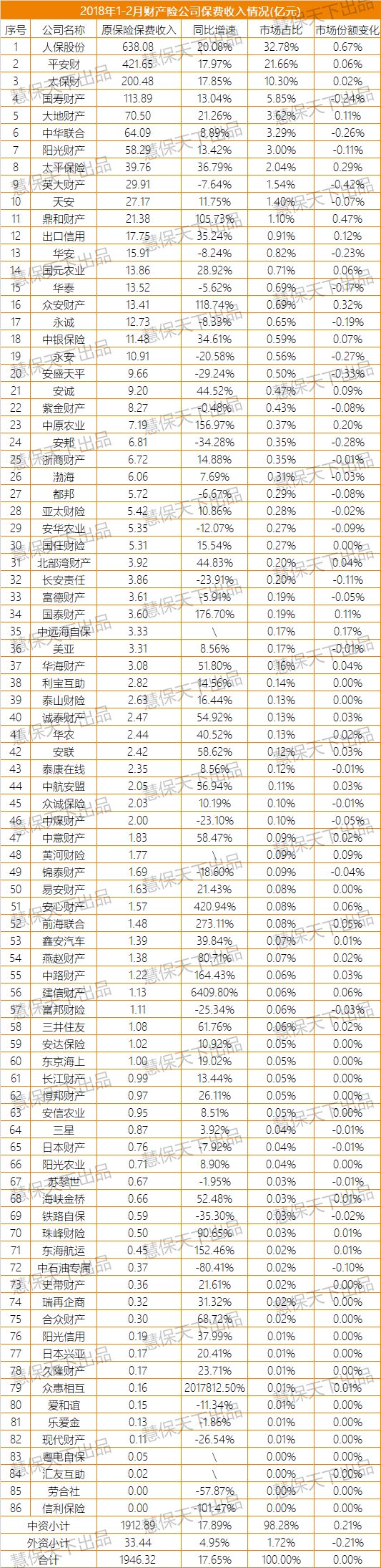 从各公司情况来看,老三家增速呈现并驾齐驱之势,人保继续保持了1月份超20%的增速,平安产险和太保产险增速近18%,略高于行业平均水平。国寿财险增速超13%,其保费收入113亿元,是前2月第四家保费突破百亿的险企。