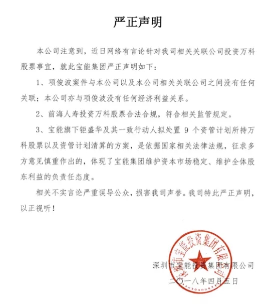 4月5日晚间,宝能在其官网发布声明称,项俊波案件与公司没有任何关联,公司与其亦没有任何经济利益关系;前海人寿投资万科股票合法合规,符合相关监管规定;拟处置所持万科股份及清算方案是征求多方意见慎重作出的,体现宝能维护资本市场稳定及全体股东利益的负责任态度。