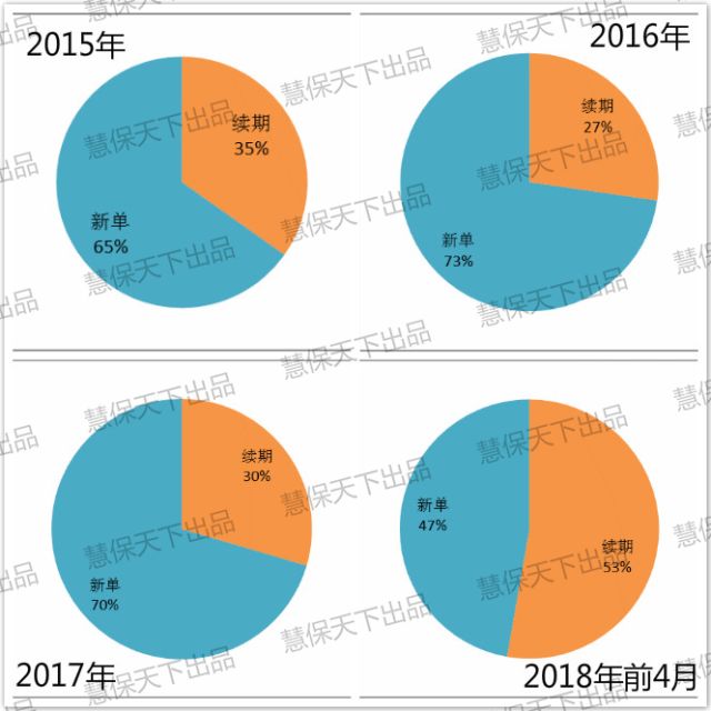 但到2018年,新单保费再也无法拉动增长了。从图中可以清晰看到,续期保费在2018年前4月的占比达到了53% ,比去年提升了23个百分点,成为拉动保费增长的最主要因素。