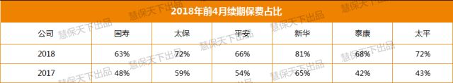 行业交流数据显示,2018年1-4月,保费超100亿元且续期保费占比超60%的公司有6家,即“老六家”:中国人寿、太保寿险、平安人寿、新华保险、泰康人寿、太平人寿。其中,占比最高的是新华人寿,续期保费占比达到81%,最低的是中国人寿,不过也达到了61%。而2017年1-4月这6家公司中,续期保费占比最高的仅为65%,最低更是只有42%。