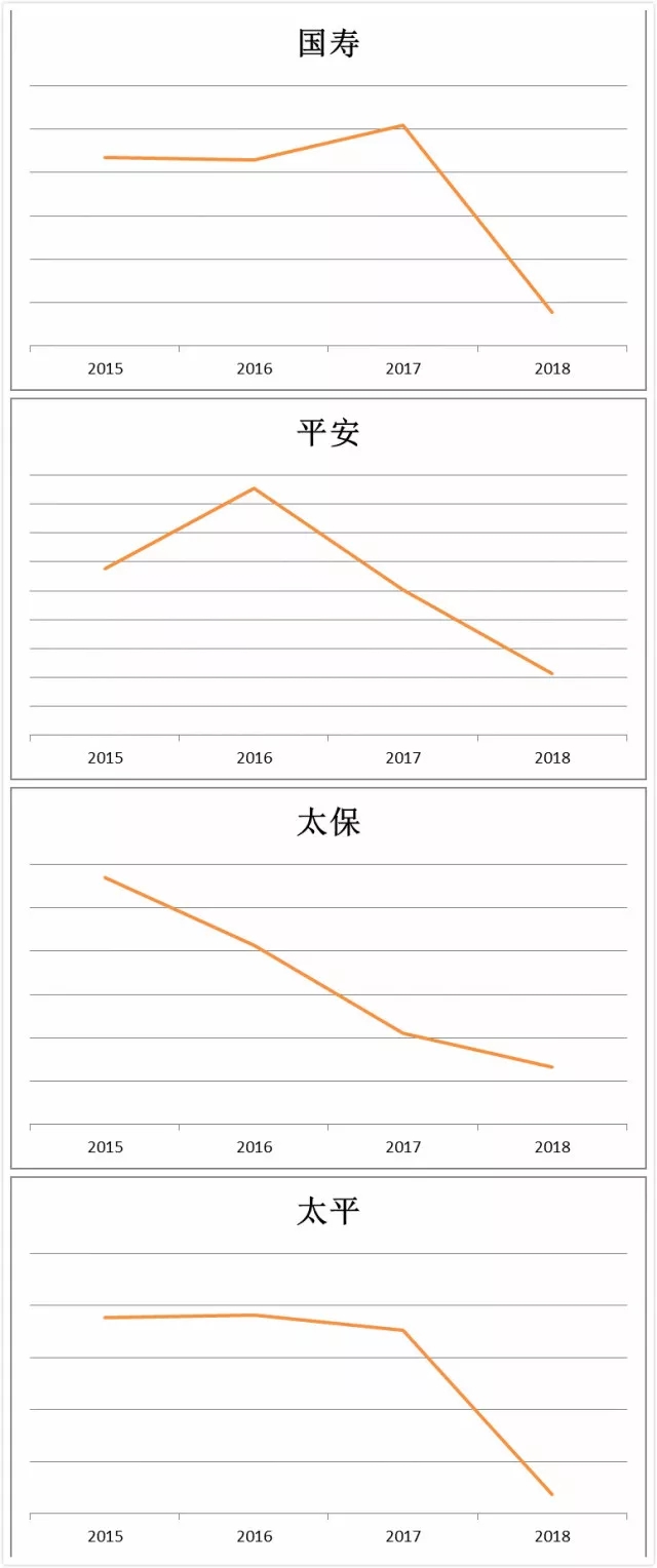 在各类监管文件严控下,老牌公司已将银保渠道趸交保费彻底边缘化。平安人寿、太保寿险等公司已彻底放弃对银保渠道的考核;中国人寿、太平人寿等公司银保趸交业务也是大幅收缩。在这些老牌寿险公司眼中,银保趸交保费天生自带“鸡肋”属性。从下图中可以清晰地看到,2018年前4月,老牌寿险公司银保渠道保费均有较大回落。