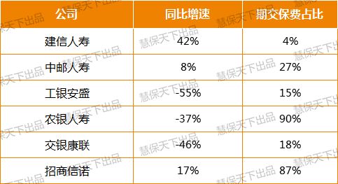 截至4月底,6家银行系公司中,建信人寿保费收入最高,中邮紧随其次。从增速看,三家正增长,三家负增长,建信人寿同比增长42%,工银安盛同比下降55%。