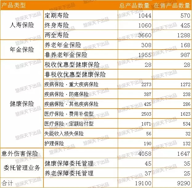 相较而言,人身险产品由于责任种类相对较少,产品数量似乎相较财产险产品应该要少很多,但实际上,目前在售的人身险产品数量也颇为惊人。查询中保协官网的人身保险产品信息库发现,目前总产品数量达到了19100个,其中在售的产品包括9290个,目前有保费统计的人身险公司为86家,意味着平均每家公司在售产品数量多达108个。