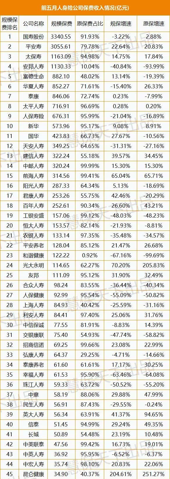 前5月,依然是中国人寿与平安寿险两强相争的格局。前5月中国人寿规模保费收入3340亿元,其原保费占比高达92%,虽然规模保费增速为-3.22%,但仍然占据榜首位置。平安寿险前5月规模保费超3000亿元,增速高达22.64%,其原保费增速亦超20%,正在缩小与中国人寿的差距。