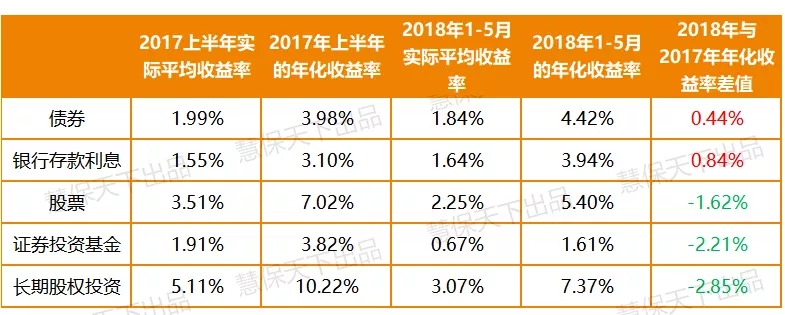 具体来看,首先在年化收益率比较中,2018年上半年仅有债券和银行存款利息两项的年化收益率小幅超越2017年同期(分别高出44BP和84BP),但是股票、证券投资基金和长期股权投资均大幅落后于2017年同期(分别落后162BP、221BP、285BP)。