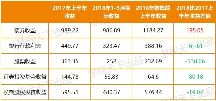 其次,在资金运用收益绝对值比较上,基于2018年1-5月的实际收益水平推算出2018年的上半年收益和2017年同期做对比:除了债券收益有超出去年同期195.05亿元的正向贡献外,收益率水平略微胜出的银行存款利息在规模被抵消后整体收益仍不敌2017年上半年,收益同比少61.61亿元。股票收益、证券投资基金收益、长期股权投资收益更是全面完败,对整体资金运用收益贡献的绝对值分别比去年同期少了130.66亿元、80.18亿元和19.07亿元。两相抵减,2018年半年收益总额比2017年同期减少96.47亿元。