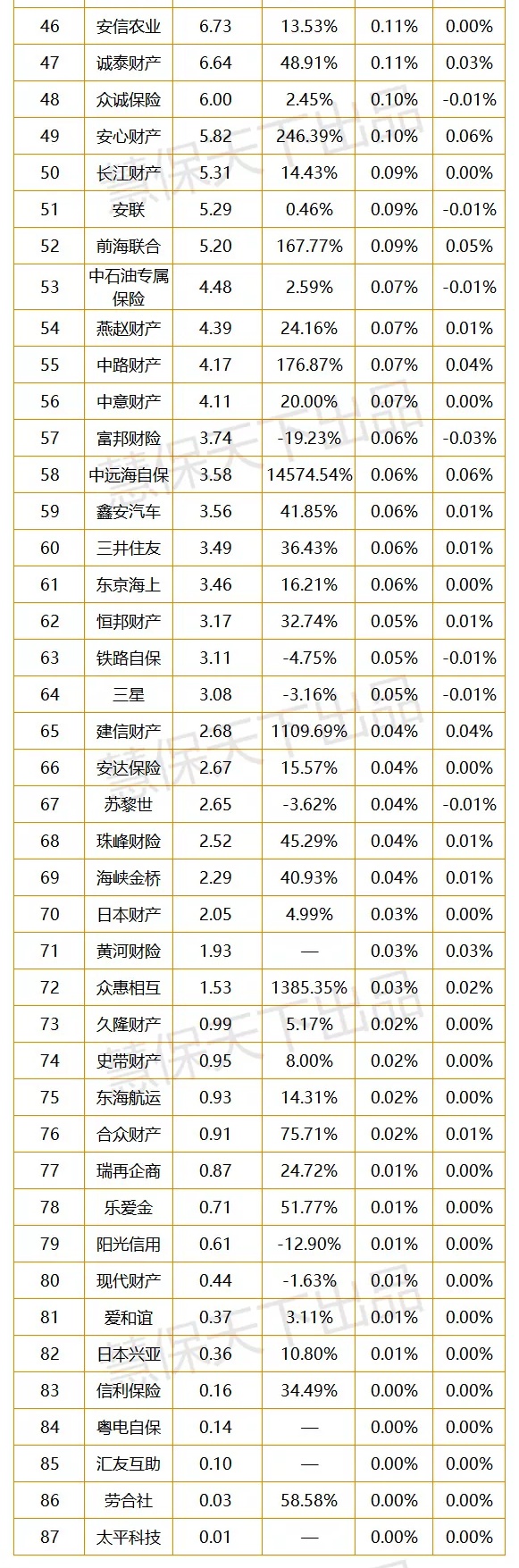 其余的79家险企中,有13家保费出现同比负增长,其中又以安邦财险为最,负增长幅度达到40.28%,其次是安盛天平,负增长也达到了28.80%。同样负增长两位数的还包括富邦财险以及阳光信保,增速分别为-19.23%、-12.90%。
