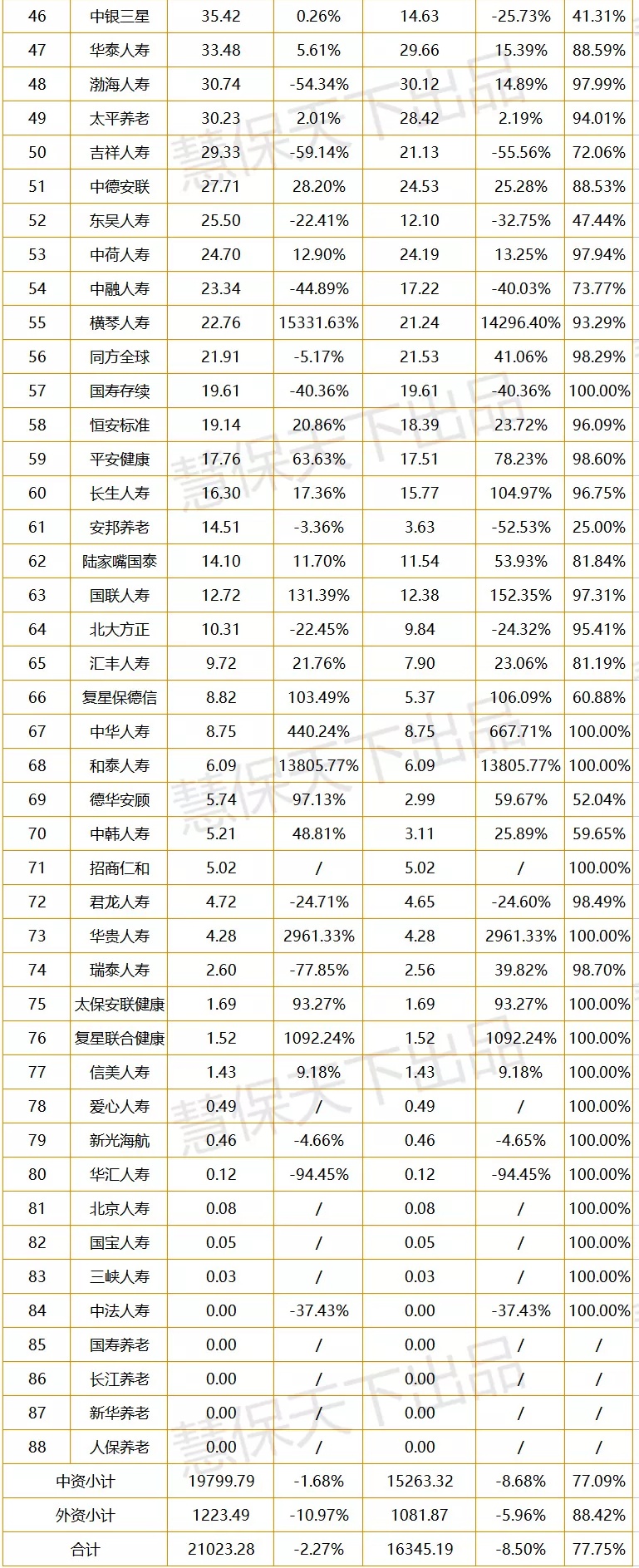 外资寿险公司的规模保费同比降幅更加明显,但其原保险保费收入相对较稳健。根据数据,前6月,外资寿险公司的规模保费同比降幅达10.97%,远高于中资寿险公司1.68%的降幅,但外资寿险公司的原保险保费收入降幅仅为5.96%,低于中资-8.68%的降幅。