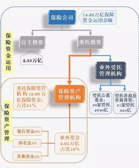 保险资管机构承担了绝大部分保险资金运用的职能。根据脉络图,在2017年末,14.92万亿的保险资金运用余额中,约80%的资金是通过委托保险资管机构进行投资,约17%的资金是通过保险公司自主投资,剩下约3%的资金则是通过业外的受托管理机构(公募基金、券商等)进行投资。