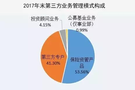 而第三方业务又以保险资管产品和专户管理模式为主。在2017年末的第三方业务管理模式中,保险资管产品占比最高,达53.56%,第三方专户占比第二,为41.30%。在资管产品中,绝大部分为组合类保险资管产品和债券投资计划,合计占比达88%。