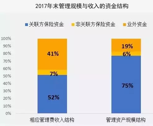 从保险资管机构的收入结构来看,业外资金对其管理费收入贡献度最大。在保险资管机构所管理的资产中,业外资金的规模占比仅19%,但却了41%的管理费收入。
