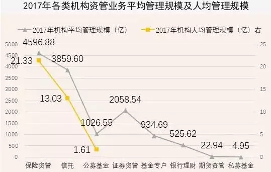 从管理效能来看,保险资管机构的资金管理效能位居市场前列。脉络图数据显示,2017年,保险资管的机构平均管理规模最大,达4596.88亿元,远超信托、公募基金、证券资管等机构的规模,同时,保险资管机构的人均管理规模也是最高的,达21.33亿/人。