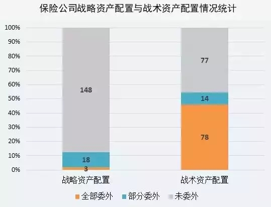 对于绝大部分的战略资产配置,保险公司通常选择自己管理,而非委外。根据脉络图,对于战略资产配置,87%的保险公司没有选择委外,而对于战术资产配置,只有46%的保险公司不选择委外。