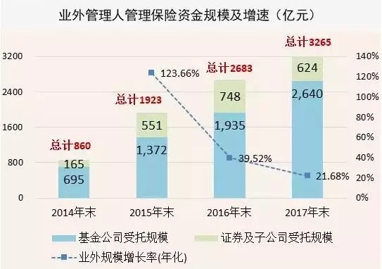 相比保险资管机构和保险公司自身,业外受托管理机构所管理的保险资金规模很小,且增速逐年下降。根据脉络图,在2017年末,14.92万亿的保险资金运用余额中,仅有3%的资金是通过业外的受托管理机构(公募基金、券商等)进行投资,同时,其规模增速已由2015年的123.66%下降到2017年的21.68%。