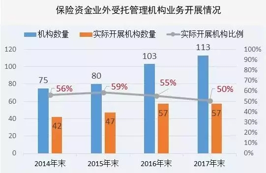 此外,近半数具备资格的业外受托机构并未实际开展保险资金管理业务。脉络图显示,2017年末,具备受托管理保险资金资格的业外管理机构共计113家,其中,公墓基金公司68家,证券公司及证券资管公司45家。但113家公司中,仅有57家实际开展了相关业务,占比逐年下降。