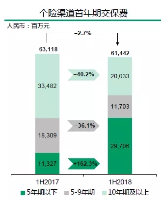 不过值得注意的是,从中国人寿披露的个险以及银保渠道期交业务构成来看,两个渠道新单期交业务中,增长最快的都是5年期以下产品,可见中国人寿为应对新单保费收入的下滑,大量发展5年期以下产品,并不追求一步到位的转型,显示出了较为务实的一面。