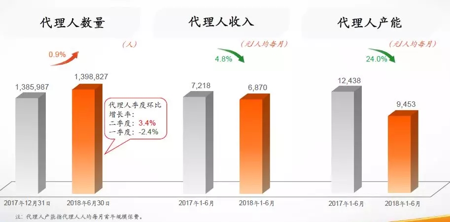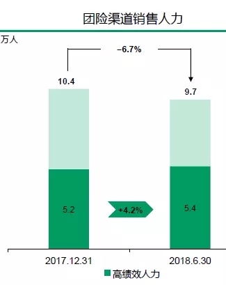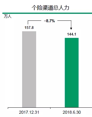 个险渠道保费收入达到2722.33亿元,同比增长19.7%,其中新单保费674.52亿元,同比微降0.5个百分点,但总人力却从2017年底的157.8万人下降至了144.1万人,下降8.7%。