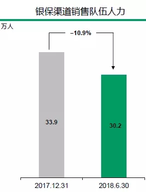 与此同时,银保渠道业务结构改善明显,在趸交保费大幅负增长的同时,首年期交保费、续期保费的同比增幅都达到了40%以上,在银保渠道总保费中的占比也大幅提升。不过中国人寿银保渠道的人力也出现了一定程度的下滑,从2017年底的33.9万人下滑至30.2万人,减少一成有余。