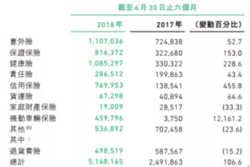 数据显示,众安在线旨在为中国主流的电商平台(淘宝及天猫)等提供产品质量、物流、售后服务、商家保证金等风险保障的“生活消费生态”总保费截至2018年6月30日约人民币7.53亿元,较去年同期下降约17.2%,在总保费收入中的占比也从去年6月末的36.48%下降至14.63%。