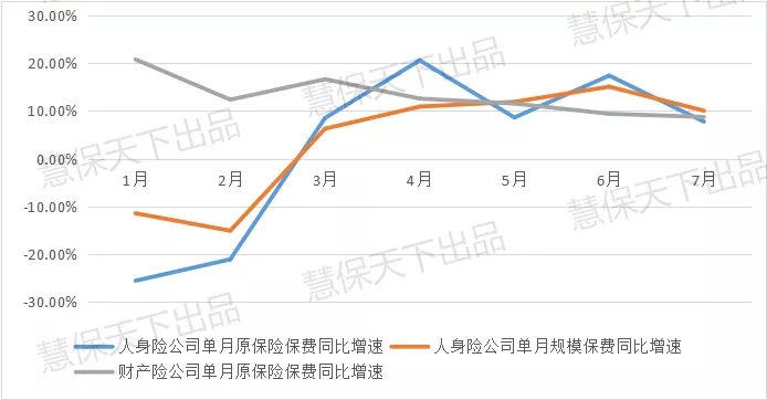 从单月保费同比增速来看,无论是原保险保费,还是规模保费,人身险公司1-2月均为负数,直到3月才转负为正,此后数月都维持正增长,只是到7月,增速相较6月又不约而同出现了下滑。至于财产险公司,其单月原保险保费收入同比增速自3月开始就一直处于不断下滑态势。