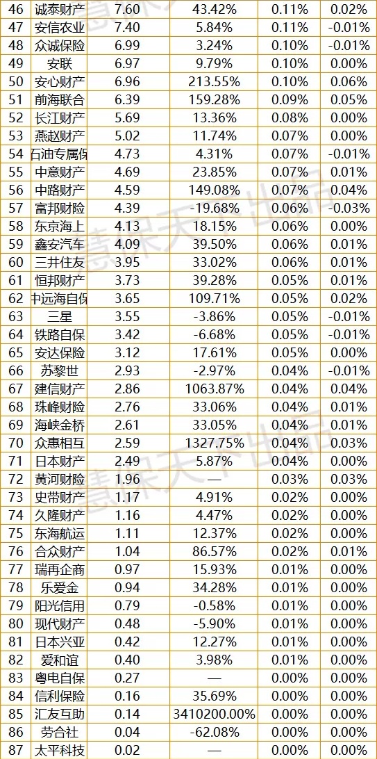 排名第4至第11名的险企,保费增速则出现显著分化,国寿财险、中华联合、中国信保仅保持了个位数的同比增速,而大地保险、阳光产险、太平保险以及天安财险、华安保险则都实现了两位数的同比增速,不过,超过行业平均水平的只有两家:大地保险以及太平保险。