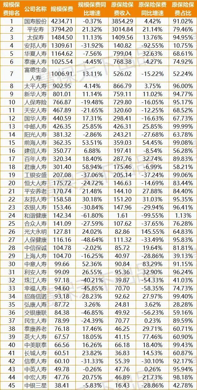 具体从公司层面看,中国人寿与平安寿险分别实现规模保费4234.71亿元、3794.20亿元,仍稳坐行业第一、二之位。其中,中国人寿业务发展逐渐回暖,规模保费同比增速为-0.37%,与前6月的-1.27%相比降幅收窄,原保险保费收入同比增速为4.42%,比前6月提高0.37个百分点;而平安寿险的业务增速则有所放缓,规模保费同比增长21.32%,比前6月下降0.68个百分点,原保险保费增速为21.14%,与前6月几乎持平。