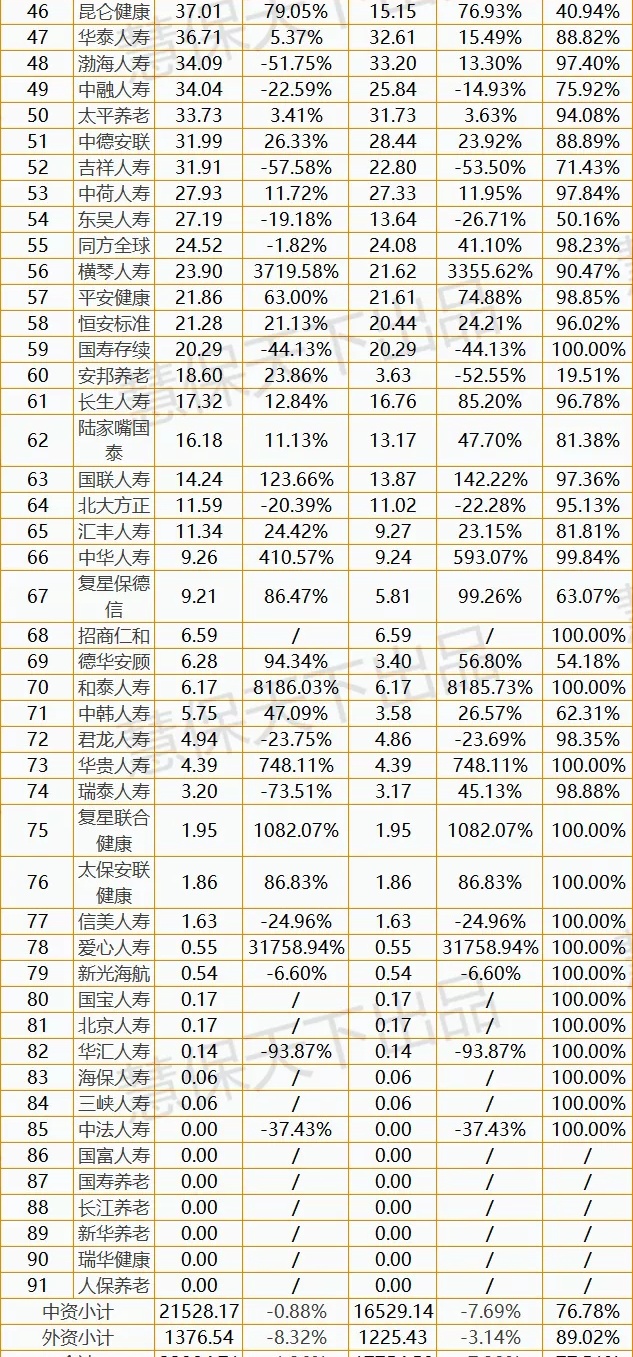 规模保费排名前十的保险公司排名也所有变化,人保寿险规模保费持续负增长。前7月,人保寿险实现规模保费766.87亿元,同比增速为-19.48%,前十名中,增速仅高于安邦人寿。在连续几个月以百分之十五以上的速度负增长之后,人保寿险的排名由第9下降为第10名,被新华人寿赶超。