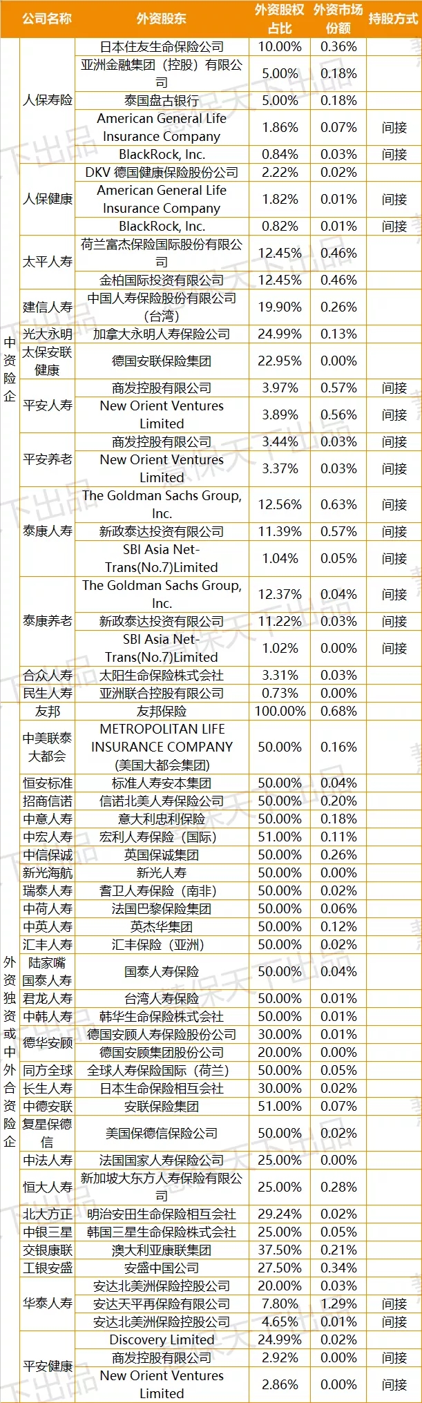 3、外资“重仓”头部险企。具体到公司来看,不论财险还是寿险业,头部险企中都能找到国外资本的身影。