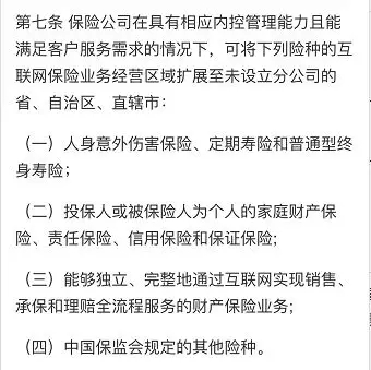 众所周知,一般来说,保险公司只能在设立有分支机构的地区开展业务,但为了促进互联网保险的发展,2015版《互联网保险业务监管暂行办法》从一开始就规定,有一些险种是不需要设立分支机构就可以进行销售的。