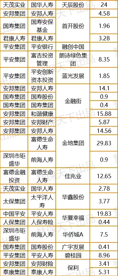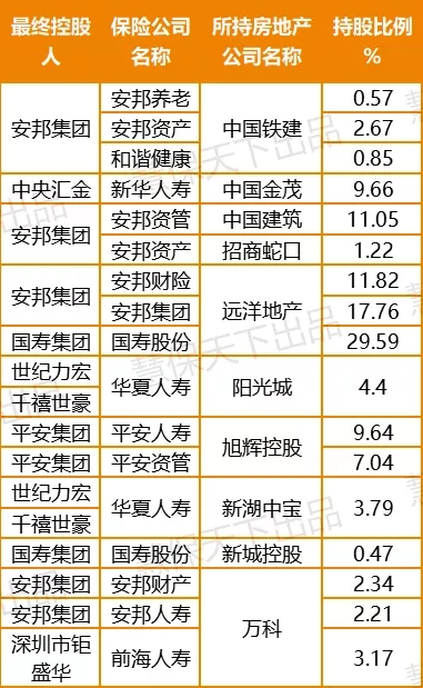 而从保险公司的角度来看,除了安邦保险集团、富德生命、前海人寿、华夏人寿这些险企之外,中国人寿、中国平安、新华保险、泰康人寿这些稳健的传统大中型保险企业显然也对房地产企业充满热情。