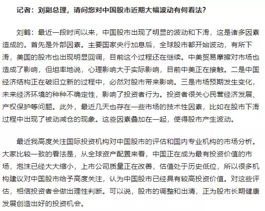 关于近期A股出现明显的波动和下滑,刘鹤认为其中原因是同时受到了多重因素的影响,包括主要国家央行加息、中美贸易摩擦、中国经济结构调整、市场预期变化等。但从全球资产配置来看,中国正在成为最有投资价值的市场。同时,多个部门已经推出了至少五大方面的政策及措施。