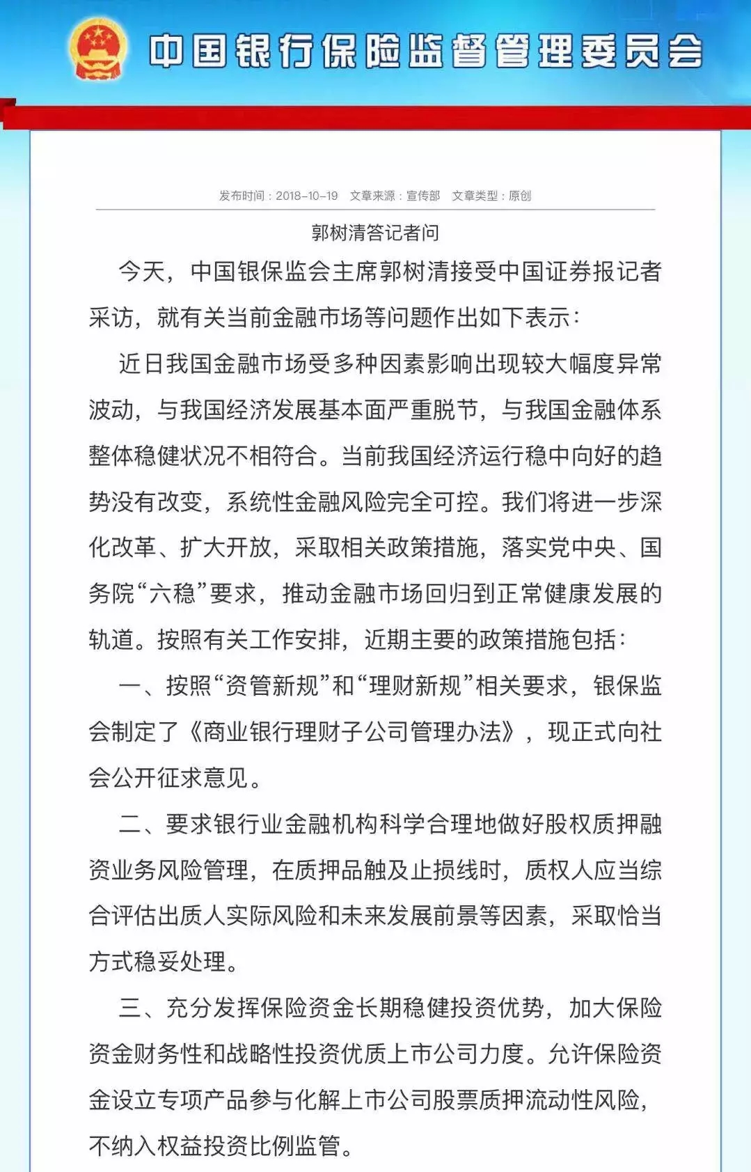 郭树清同样表示,近日我国金融市场的大幅度异常波动,与我国金融体系整体稳健状况不相符合;同时,银保监会出台三项政策措施,以推动金融市场回归到正常健康发展的轨道,其中,包括加大保险资金财务性和战略性投资优质上市公司力度,允许保险资金设立专项产品参与化解上市公司股票质押流动性风险,不纳入权益投资比例监管。