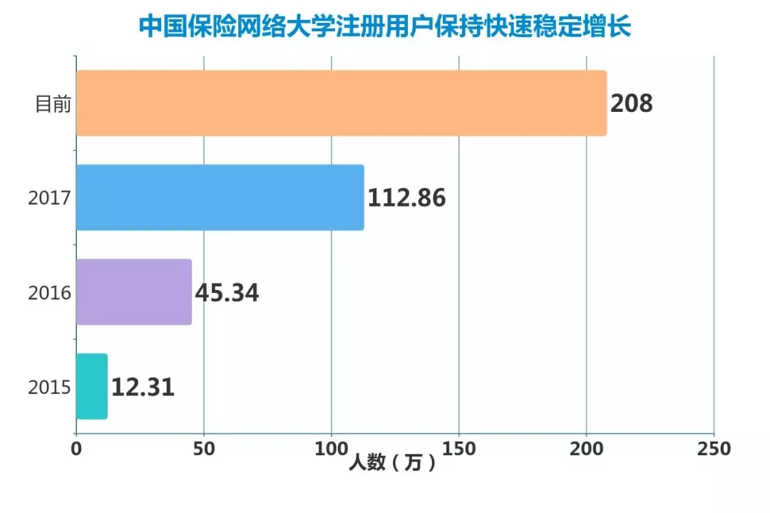 自2014年10月上线至今,中国保险网络大学一直保持快速稳定发展,网站注册用户在2015年首年超过12万人后,年均增长率超过198%,截至目前达208万人。用户人群囊括业内全部市场主体、各层级机构,覆盖董、监、高层级、中基层管理人员和一线销售人员。
