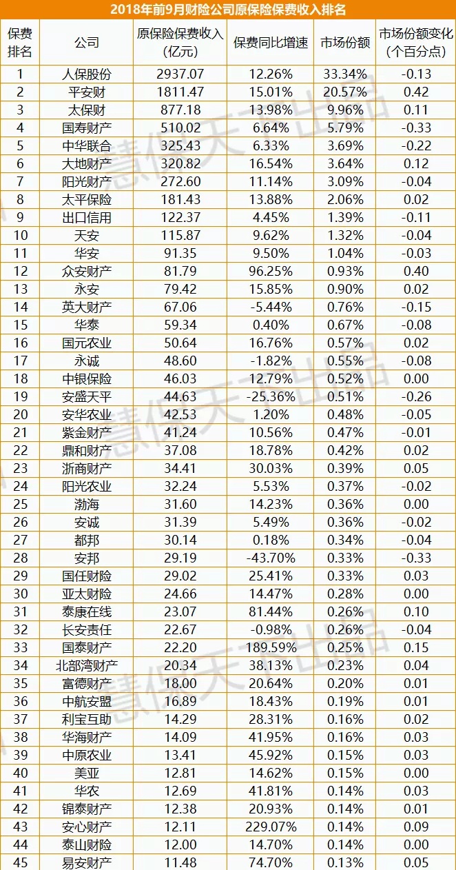 从各险企市场份额的变化来看,市场份额占比第二的平安产险仍然保持了快速扩张的趋势,其市场份额相比去年同期增长0.42个百分点,在全行业增幅最大,而首家互联网保险公司众安保险以及由互联网巨头蚂蚁金服控股的国泰财险的市场份额分别同比增加0.40、0.15个百分点,增幅排名第二、三;与此同时,安邦财险、国寿财险、安盛天平三家险企的市场份额萎缩最为明显,分别同比下降0.33、0.33、0.26个百分点。