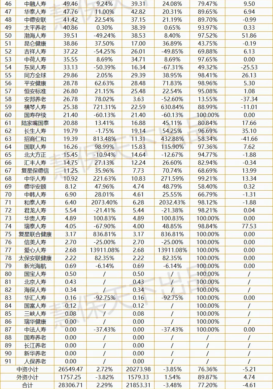 与此同时,东吴人寿、吉祥人寿、和谐健康、瑞泰人寿、华汇人寿等5家险企的规模保费同比负增长超过50%。其中,华汇人寿的规模保费同比增速为-92.75%,排名行业倒数第一;瑞泰人寿的增速下滑则主要源于向保障型产品的转型,其规模保费同比增速为-67.90%,排名行业倒数第二,但其原保险保费收入同比增加48.85%,占规模保费比例同比上升77.53个百分点,增幅为行业第一;而和谐健康的保障型产品几乎停摆,原保险保费收入同比增速-99.44%,占规模保费比例仅1.21%,占比同比下降94.11个百分点。