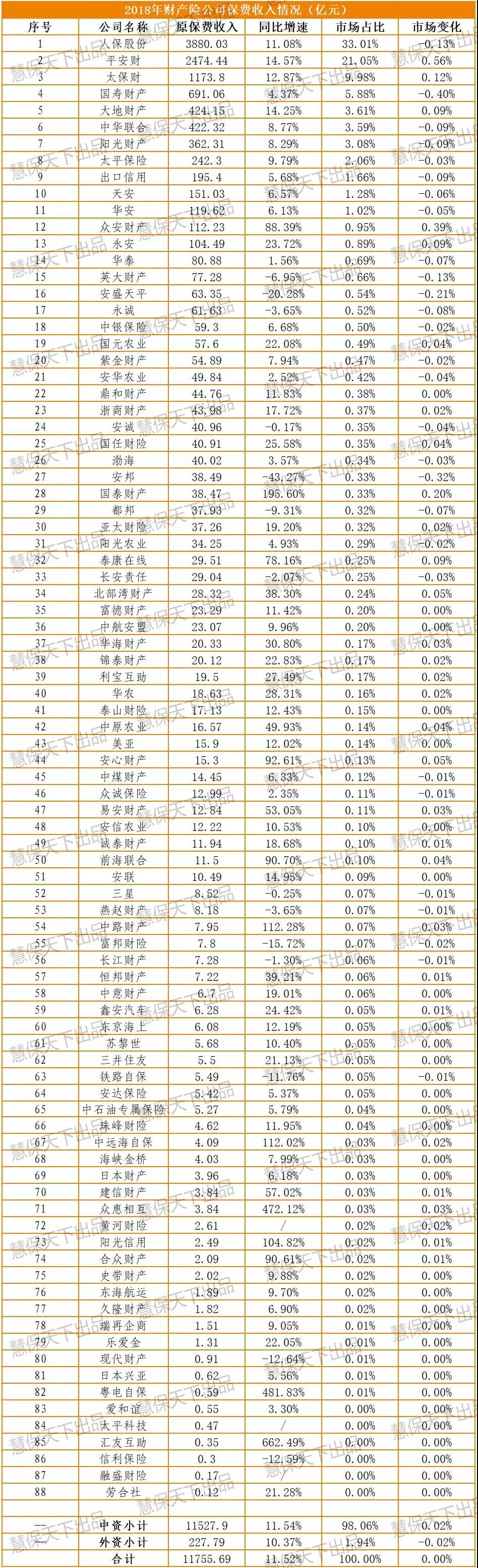 1月29日,银保监会官网公布了2018年度财产险公司保费收入情况,88家产险公司原保费收入11755.69亿元,同比增长11.52%。其中,人保财险原保费收入3880亿元,增速11.08%略低于行业平均数据,堪堪守住了三分之一的“江山”。