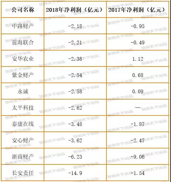 其中,亏损最严重的10家险企分别为中路财险、前海联合、安华农险、紫金财险、永诚保险、太平科技、泰康在线、安心财险、浙商财险以及长安责任。