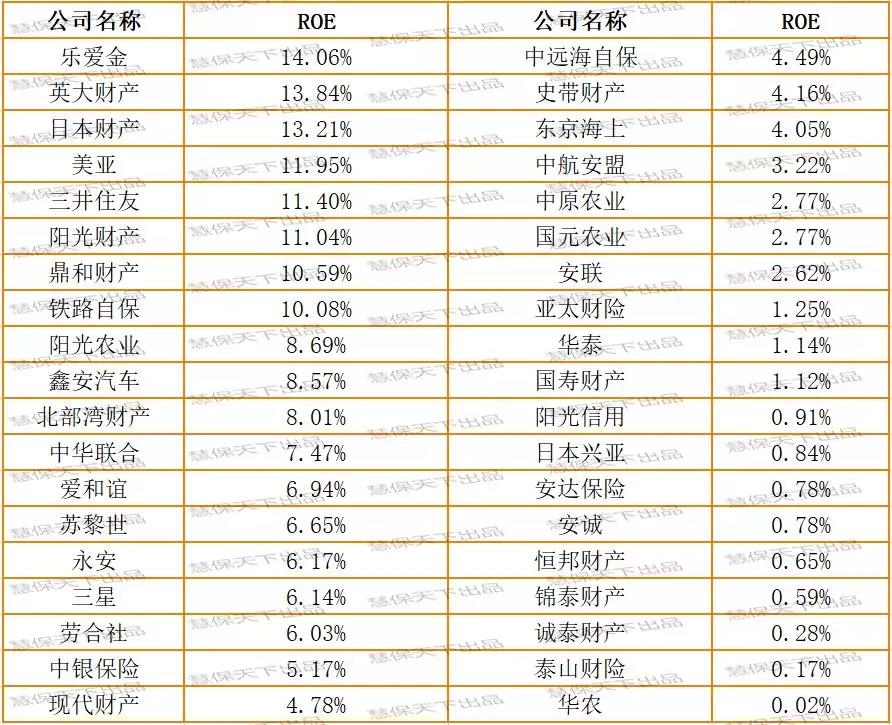 数据显示,38家盈利的险企中,只有8家的ROE超过了10%,中资、外资险企各占一半。其中,中资险企包括英大财险、阳光财险、鼎和财险以及铁路自保,而外资险企则包括乐爱金、日本财险、美亚财险以及三井住友。