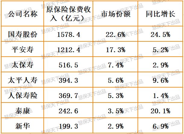 市场头部企业保费增速出现显著分化:数据显示,“老七家”险企中,除中国人寿以及泰康人寿的原保险保费收入实现了20%以上的同比增速外,其余包括平安人寿在内的5家险企的同比增速均只有个位数。