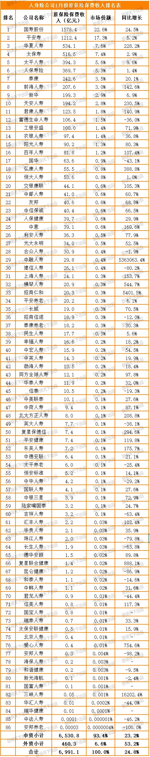 人身险1月战绩:原保费增长24%,21家负增长,平安寿份额同比减少3%行业动态