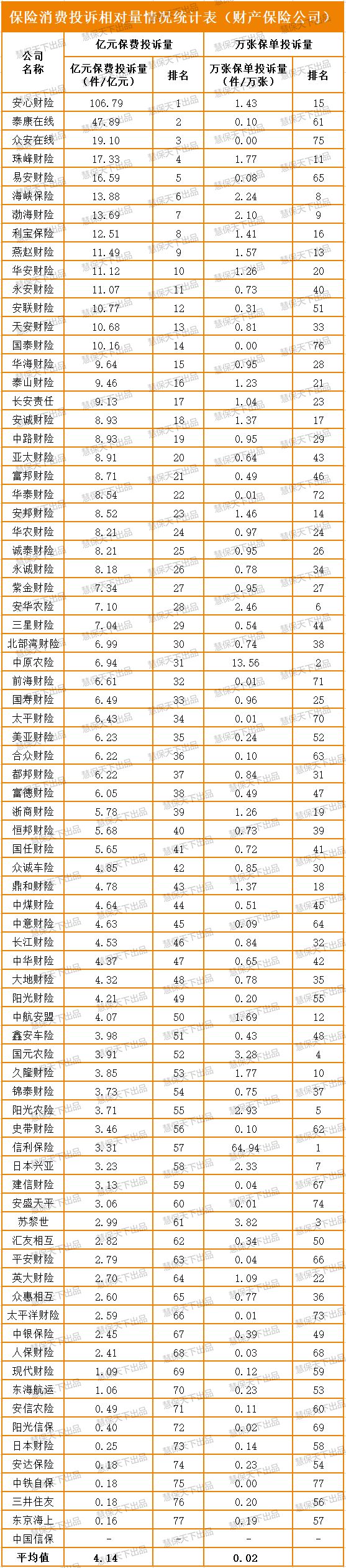 对比投诉数量与业务量来看,中小险企亿元保费投诉量和万张保单投诉量的数值相对较高。其中,财产保险公司亿元保费投诉量平均值为4.14件/亿元,安心财险、泰康在线、众安在线稳居三“甲”,易安保险亦是排名第五,珠峰财险、海峡保险、渤海财险、利宝保险、燕赵财险、华安财险每亿元保费投诉量亦在11件以上。
