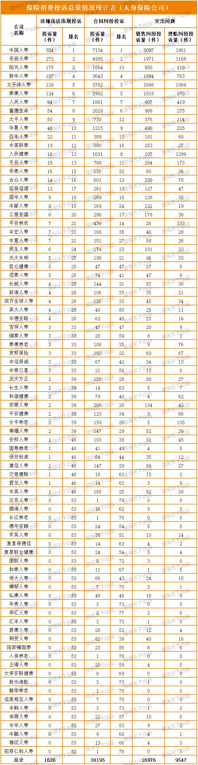 而人身保险公司合同纠纷投诉量居前10位的为中国人寿(7134件)、平安人寿(4985件)、太平洋人寿(3762件)、新华人寿、泰康人寿、富德生命、人保寿险、人保健康、华夏人寿和阳光人寿,十家险企投诉数量均超千件水平。