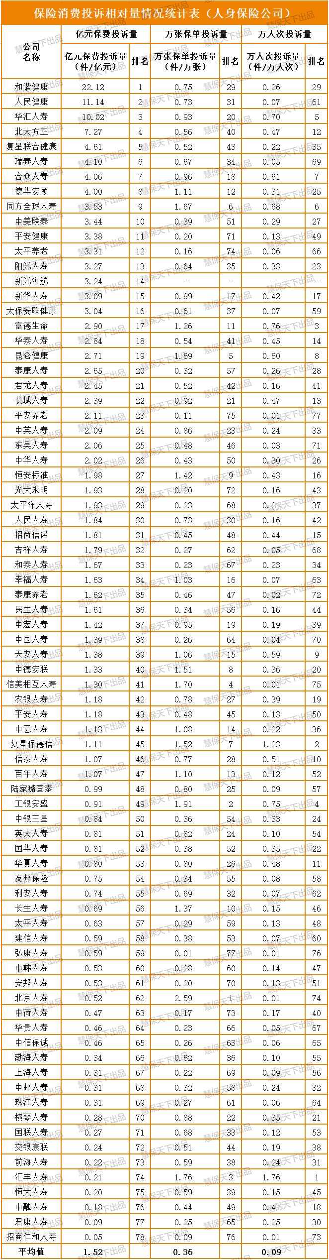 人身保险公司投诉与业务对比数据亦有同样表现,其亿元保费投诉量平均值为1.52件/亿元,和谐健康、人保健康、华汇人寿高于10件/亿元,其后是北大方正、复星联合健康、瑞泰人寿、合众人寿、德华安顾、同方全球人寿、中美联泰。