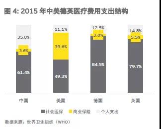 事实上,同为发达国家,德国以及英国两国的商业健康险在医疗费用支出中的占比依然很低,2015年,分别为3.0%、5.5%,其中德国甚至低于中国。