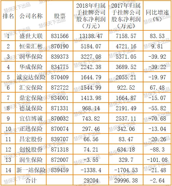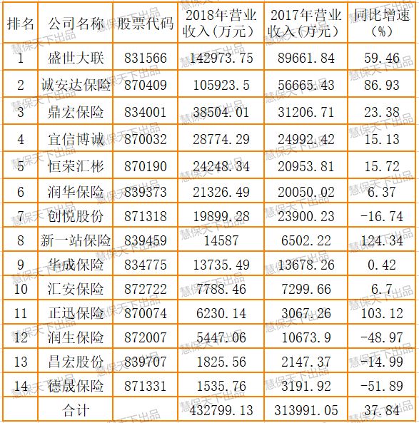 纳入『慧保天下』统计的14家新三板上市保险专业中介公司2018年合计实现营业收入43.28亿元,同比增长高达37.84%,远高于同期保险业整体3.92%的保费收入增速。