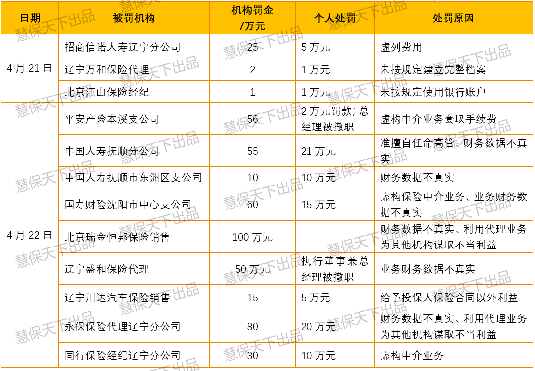 4月21—22日,辽宁银保监局连续公布28张保险业罚单,罚款金额共计596万元,涉及平安、国寿以及多家中介机构。其中针对机构罚款504万元,针对个人罚款92万元,另有两位机构负责人被撤销任职资格。